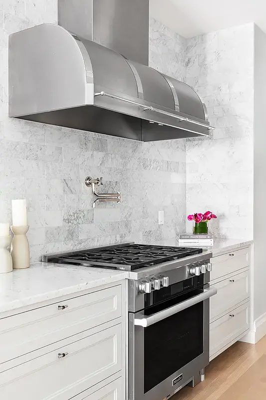 The project included furnishing 14 apartments with custom-built lacquered kitchens featuring whitewashed oak accents, bleached mahogany vanities, and built-in lacquered millwork for the recreation room.